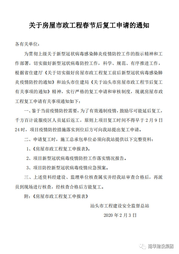關(guān)于房屋市政建設(shè)工程春節(jié)后復(fù)工申請(qǐng)的通知