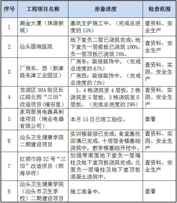 為強(qiáng)化建筑起重機(jī)械安全監(jiān)管工作,保障建筑施工安全生產(chǎn)形勢(shì)穩(wěn)定,根據(jù)汕頭市住建局文件通知,針對(duì)在建工程建筑起重機(jī)械安全專(zhuān)項(xiàng)檢查,我集團(tuán)公司予以積極配合,對(duì)各在建工程項(xiàng)目建筑起重機(jī)械進(jìn)行自查自糾,塔吊、施工電梯等起重機(jī)械設(shè)備的實(shí)體檢查、日常保養(yǎng)記錄、運(yùn)行記錄、交接班記錄、操作人員持證上崗、安全交底及定期保養(yǎng)情況均能按規(guī)定要求落實(shí)實(shí)施,確保使用安全。