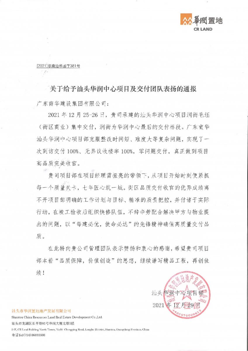集團(tuán)公司承建的汕頭華潤(rùn)中心項(xiàng)目潤(rùn)街毛坯(街區(qū)商業(yè))交付標(biāo)段克服整改時(shí)間短、難度大等復(fù)雜問(wèn)題,圓滿完成標(biāo)段任務(wù),實(shí)現(xiàn)了一次到訪交付100%、無(wú)異議收樓率100%,零問(wèn)題交付,做到項(xiàng)目高品質(zhì)完美收官而受到汕頭華潤(rùn)置地的表?yè)P(yáng)通報(bào)。