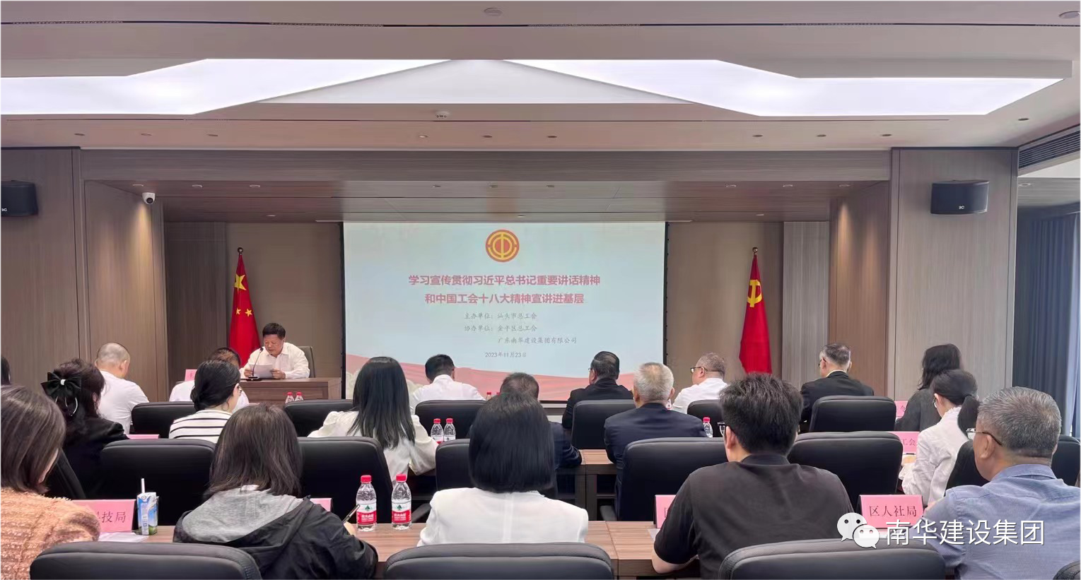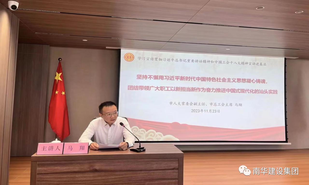 為深入學(xué)習(xí)貫徹黨的二十大精神以及習(xí)近平總書(shū)記同中華全國(guó)總工會(huì)新一屆領(lǐng)導(dǎo)班子成員集體談話時(shí)的重要講話精神,認(rèn)真貫徹落實(shí)中國(guó)工會(huì)十八大精神,切實(shí)用以武裝頭腦、指導(dǎo)實(shí)踐、推動(dòng)工作,更好引領(lǐng)廣大職工群眾聽(tīng)黨話、跟黨走,以實(shí)際行動(dòng)助力工會(huì)工作高質(zhì)量發(fā)展。11月23日上午,由汕頭市總工會(huì)主辦、金平區(qū)總工會(huì)協(xié)辦的學(xué)習(xí)貫徹習(xí)近平總書(shū)記重要講話精神和中國(guó)工會(huì)十八大精神主題宣講活動(dòng)在廣東南華建設(shè)集團(tuán)有限公司舉辦,市人大常委會(huì)副主任、市總工會(huì)主席馬翔出席活動(dòng)并作專題宣講,市、區(qū)總工會(huì)有關(guān)領(lǐng)導(dǎo)同志及我市的中國(guó)工會(huì)十八大代表、工會(huì)干部和職工代表參加學(xué)習(xí)。