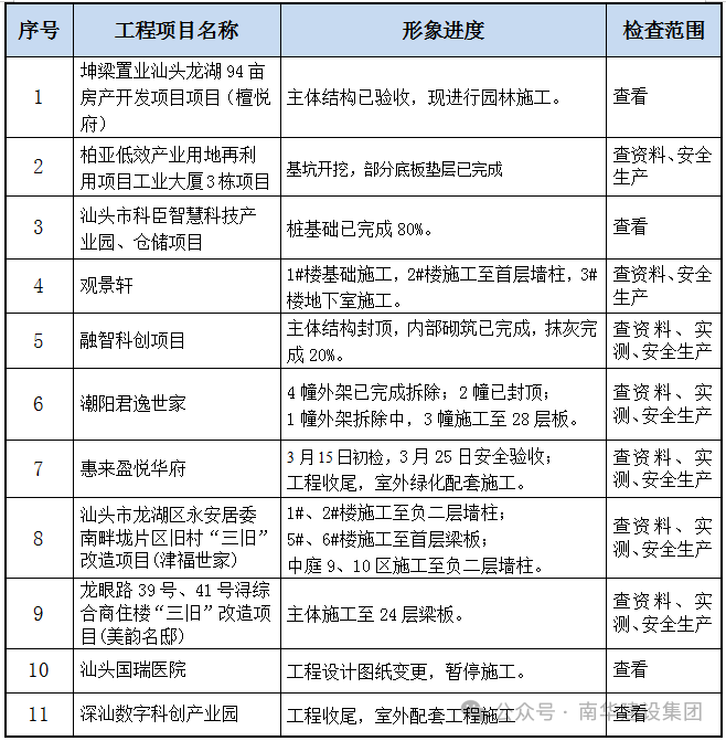 本季度正值于歲末年初及春節(jié)后復(fù)工復(fù)產(chǎn)重點時期,根據(jù)《汕頭市住房和城鄉(xiāng)建設(shè)局印發(fā)的關(guān)于開展歲末年初房屋市政工程安全隱患專項整治和督導(dǎo)檢查方案的通知》和《廣東省住房和城鄉(xiāng)建設(shè)廳關(guān)于2024年春節(jié)后房屋市政工程復(fù)工復(fù)產(chǎn)安全防范工作的通知要求》,集團公司春節(jié)前對在建項目建筑起重機械、高支模、深基坑、腳手架、高處墜落、預(yù)防坍塌和施工消防安全等工程分別進行了專項檢查,要求各在建項目及各分公司應(yīng)落實全過程消防質(zhì)量管理責任,加強施工現(xiàn)場消防安全標準化管理,深入開展專項消防安全排查整治。按要求設(shè)置消防設(shè)施和配備消防器材確保消防設(shè)施器材齊全有效。規(guī)范用火、用電、用氣管理,嚴格執(zhí)行動火審批制度,重點對宿舍、食堂、辦公室等人員密集和火災(zāi)風(fēng)險較高場所管控,排查清理不符合防火要求的活動板房。